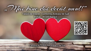 În perioada 8–10 Martie 2024, Departamentul de tineret al Conferinței Ardealul de Sud, organizează și vă invită la o tabără de tineret având genericul: “Mai bine doi decât unul”. Ca invitat îl vom avea alături de noi pe fratele Arcadi Mangul, iar versetul motto va fi din Geneza 2:18, “Nu este bine ca omul să fie singur; am să‑i fac un ajutor potrivit pentru el.”